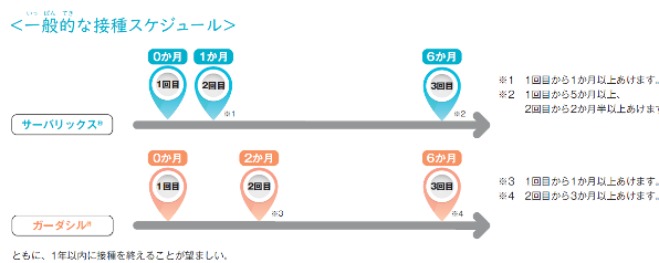 シルガード9®を合計2回の接種は、9~14歳の女性を対象に臨床試験が行われ、効果と安全性が確認されたうえで薬事承認がなされており、シルガード9®を2回接種した9~14歳の効果は、3回接種した方と比べて、劣ってはいないことが報告されています。また、米国やカナダ、オーストラリアなどの諸外国では、原則、15歳になるまでに1回目の接種を終えていれば、2回で接種完了としています。 これらの背景から、15歳になるまでに1回目の接種を行った方は、2回で接種を完了できることとしています。なお、シルガード9®を含め、HPVワクチンの定期接種は小学校6年~高校1年相当の女子が対象であり、標準的な接種期間は、中学校1年(13歳になる学年)の女子となっています。